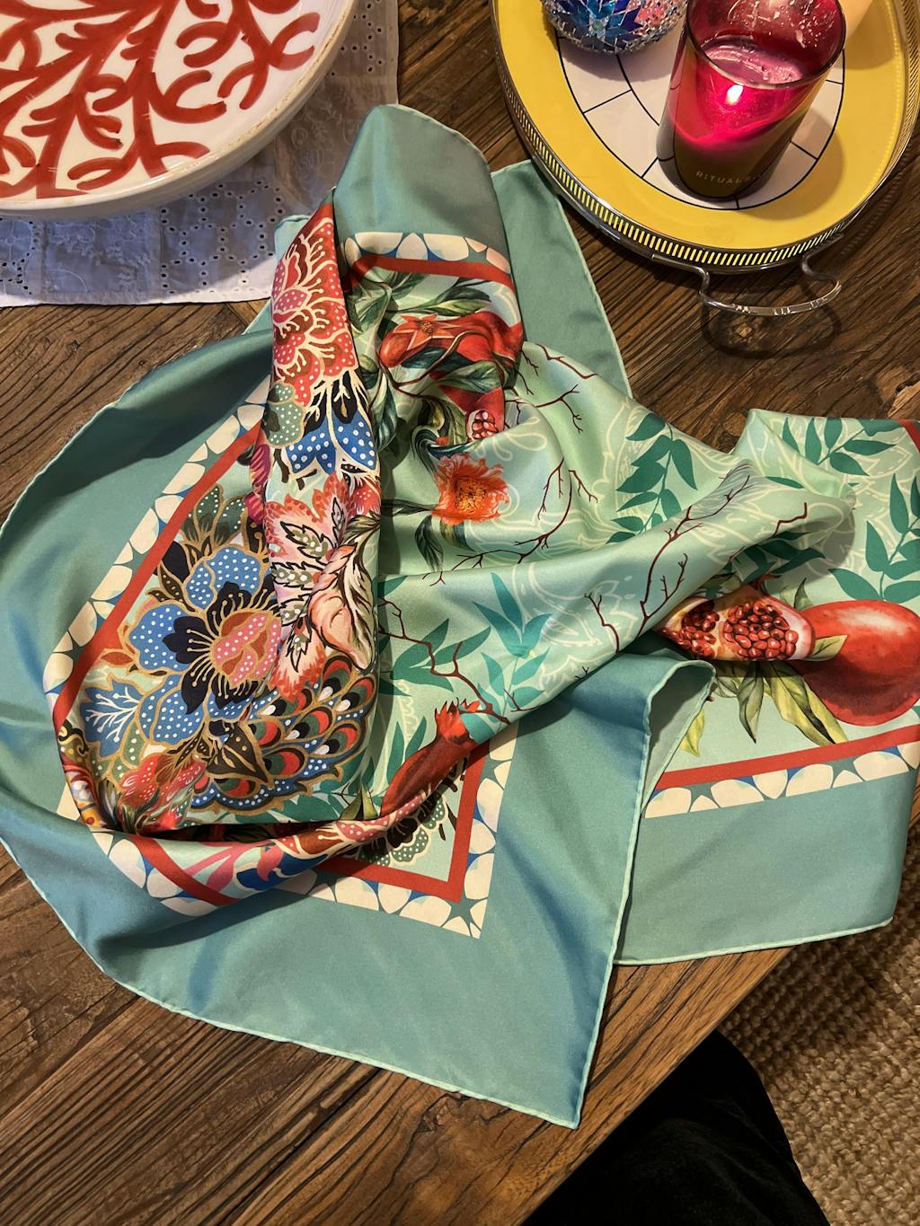 Born from the quiet abundance symbolized by the pomegranate, the Nar Scarf embodies the meeting of heritage and contemporary artistry. In Bursa—where silk has carried its stories for centuries—the design captures the exact moment the fruit splits open. Ruby-red seeds and rooted branches unfold over a soft celadon green, creating a balance of tradition and clarity.